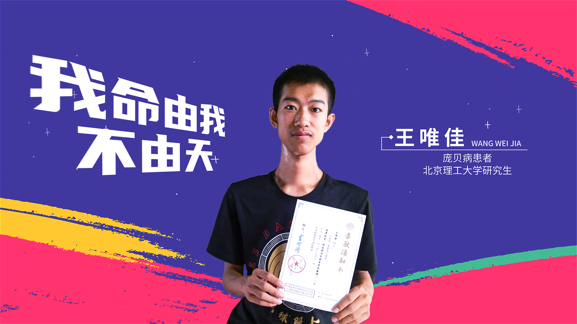 大家好,我是王唯佳,一名庞贝病患者,也是北京理工大学信息与电子学院的在读研究生。站在这里,我的双腿有些颤抖,不是因为紧张,而是因为疾病让我的肌肉日渐无力。但我想告诉大家:面对命运的宣判,我选择了说——“我命由我不由天!”